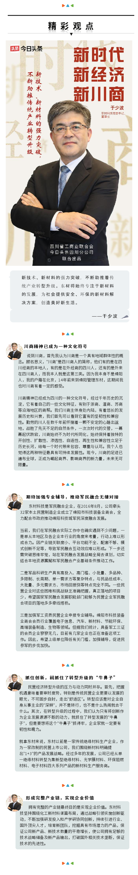 作為川內(nèi)新材料行業(yè)的排頭兵、國內(nèi)絕緣材料企業(yè)領(lǐng)軍企業(yè)的帶頭人,日前,四川東材科技集團股份有限公司公司黨委書記、董事長于少波作為新川商代表接受了《今日頭條》的專訪,分享了他對于新川商、軍民融合產(chǎn)業(yè)發(fā)展、民營企業(yè)轉(zhuǎn)型升級的看法以及未來規(guī)劃等內(nèi)容。